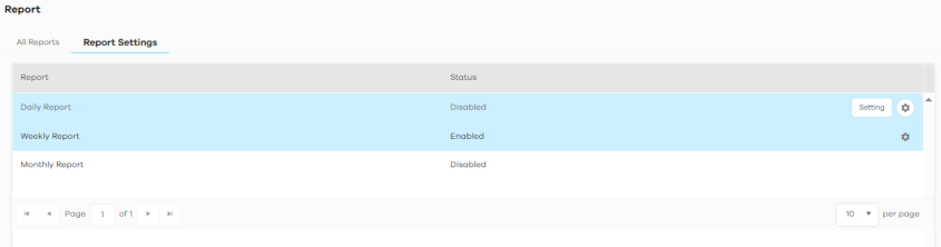 Setting | Click this icon to go to a screen to enable or disable the report, configure a cover page, configure what contents to display, and configure who to send it to. |