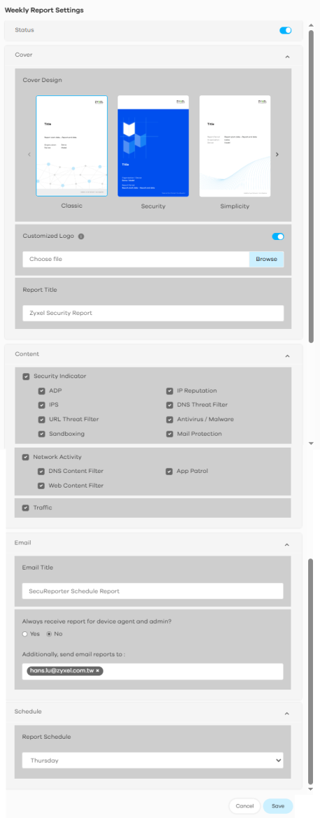 Always receive report for device agent and admin? | Select Yes to enable the sending of a report in PDF format to the Zyxel Device’s agent and admin. Refer to SecuReporter Management Privileges for the privileges of agent and admin. ![]() |