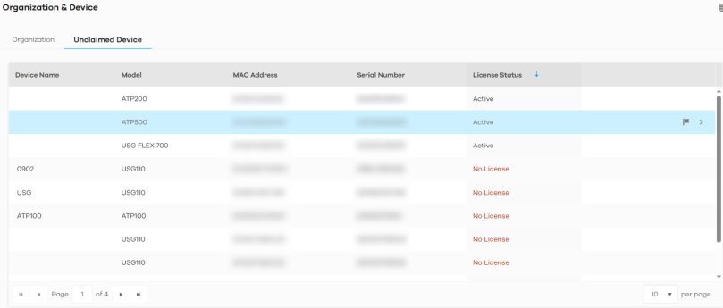 The Unclaimed Device tab displays the Zyxel Devices that are available to be added to this organization by the Zyxel Device owner.