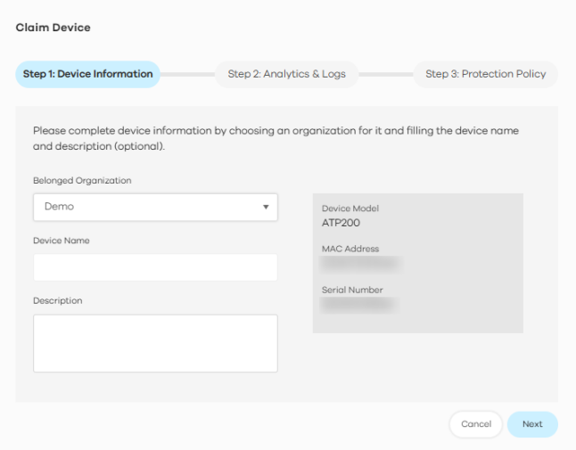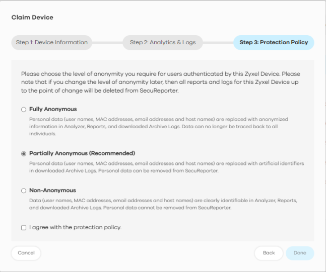 5 Read the data protection policy and then choose the level of data protection for traffic going through this Zyxel Device. Finally click Done to have the Unclaimed device become a Claimed device.