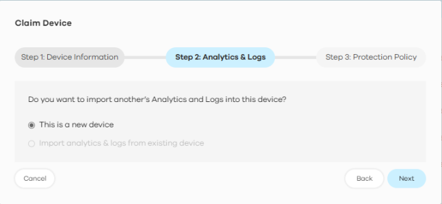 4 If this Zyxel Device was in SecuReporter before or if this is a replacement Zyxel Device for a Zyxel Device that was in SecuReporter before, then select Import Analytics & Logs from existing device; otherwise select This is a new device. Then click Next.